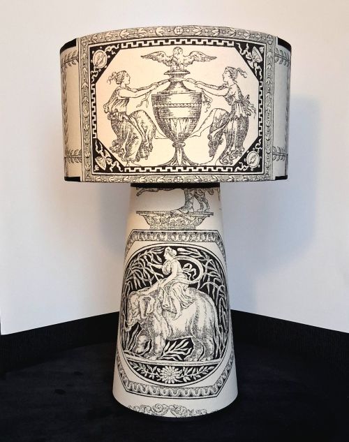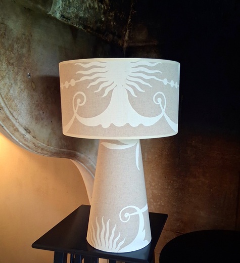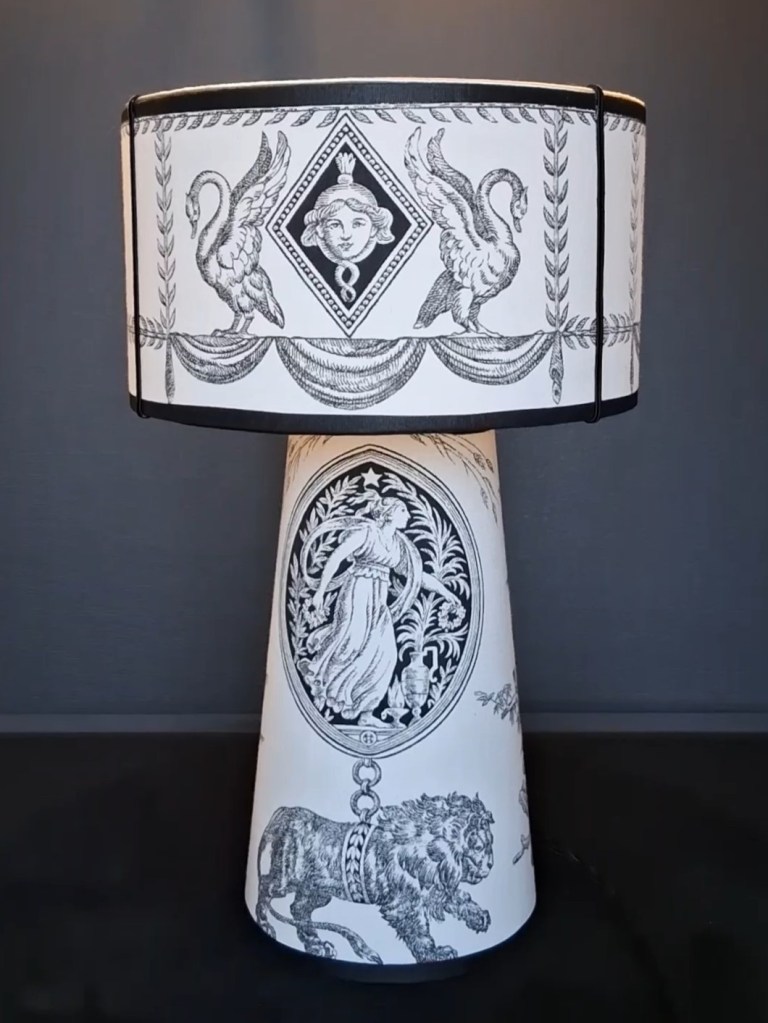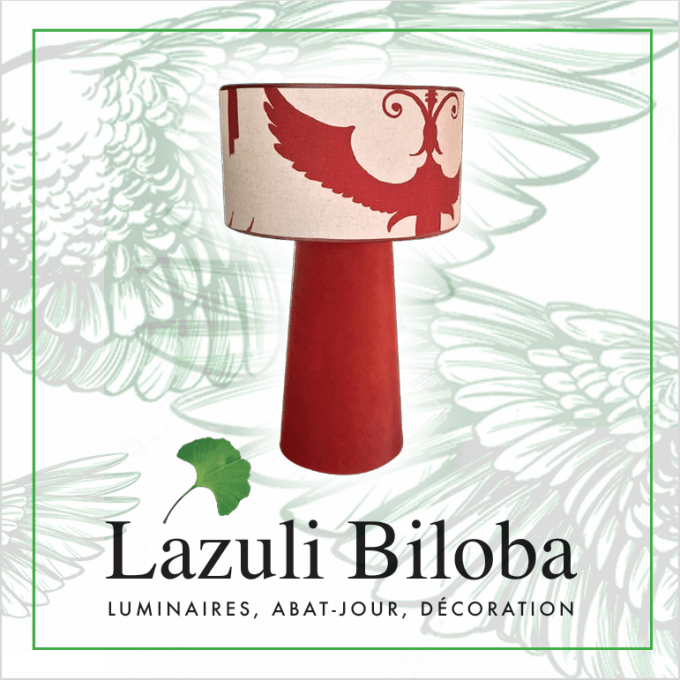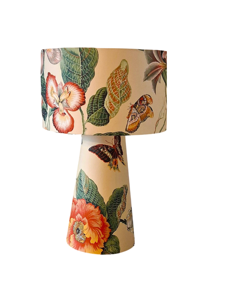 * Abat-Jour & Habillage du Pied réalisés dans le sublime tissu d’ameublement Paloma de Boussac (Groupe Pierre Frey). Cet imprimé d’exception, reconnu pour son élégance et sa qualité, offre une texture riche et un motif classique qui se révèle contemporain dans les découpes mises en lumière.